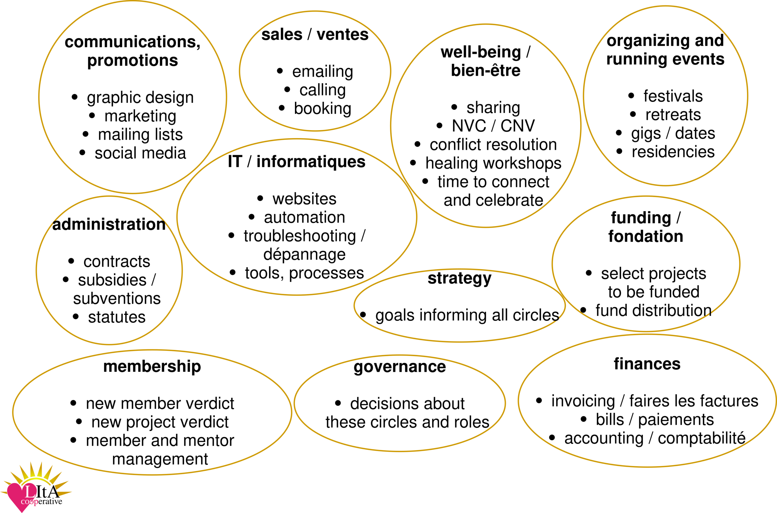 - a shared governance, nourished by holacracy and authentic communication tools,